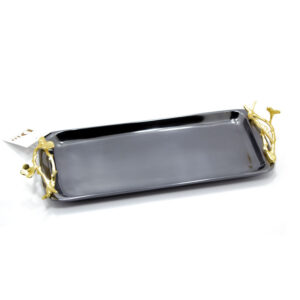 این شیرینی خوری به رنگ طلایی مات ساخته شده و بسیار شیک است. یک شاخه گل برنجی با ترکیب رنگ مشکلی و طلایی به دقت در لبه بیرونی آن کار شده و زیبایی خیره کنندهای را به این ظرف میدهد.